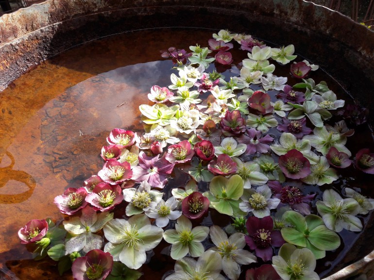 First there was a wide pool of water with the floating heads of Hellebores, upturned to enjoy the sunshine. Garden gathered Anna’s Red, White Tutu and the original, purple Tutu, Winter Moonbeam, a few hybrids… then came the big freeze –