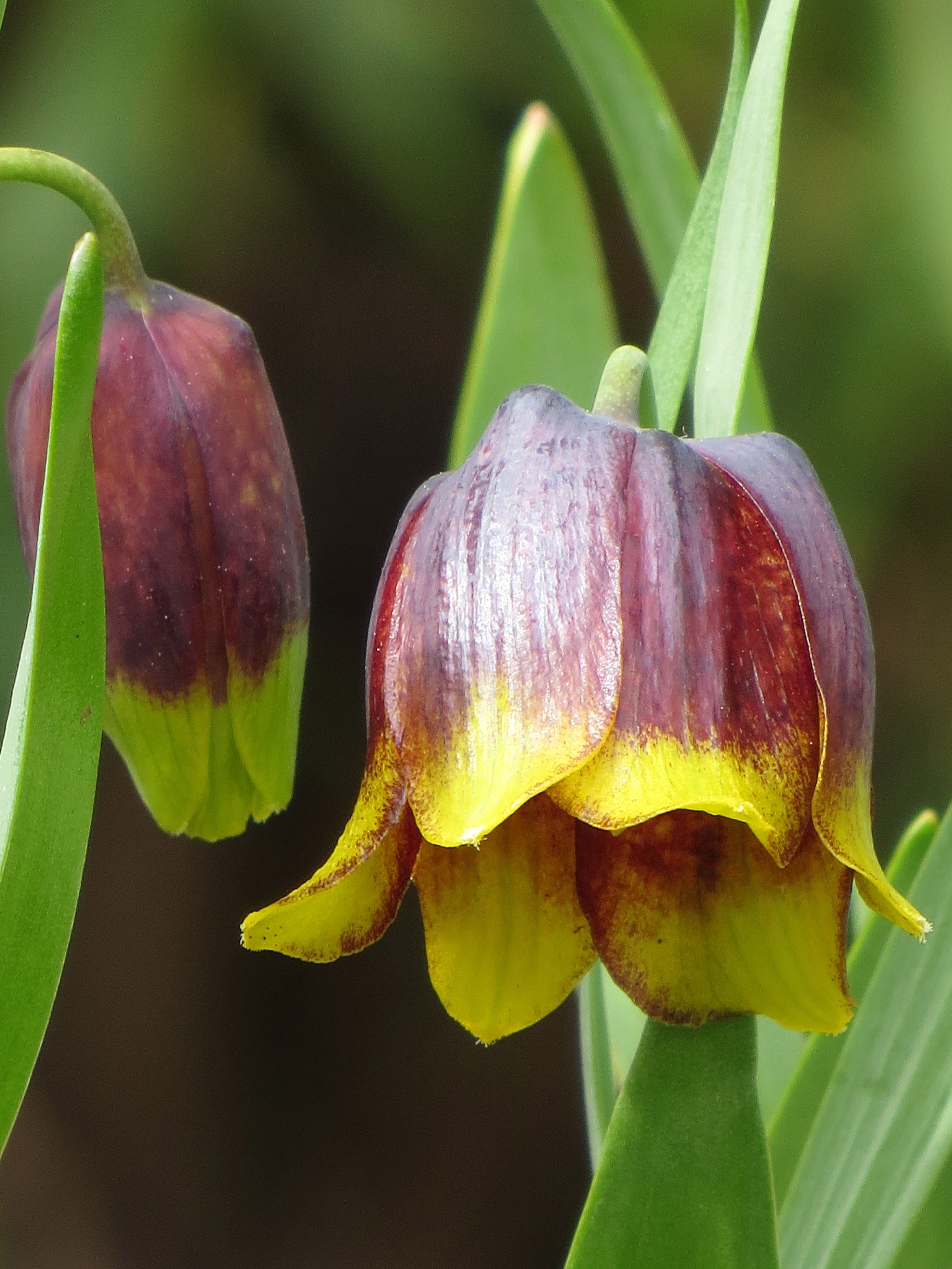 Hailing from Northern Turkey, Fritillaria michaelovskyi is a bulbous perennial with delightful, nodding, dark purple-brown flowers with distinctive yellow tipped tepals. There is a diamond pattern to the flowers, though apparent only when looking inside these little bells, with the light shining through. In matters of scale, the tepals are between 20-30mm long, on stems 6-24cm long (mine are midway)