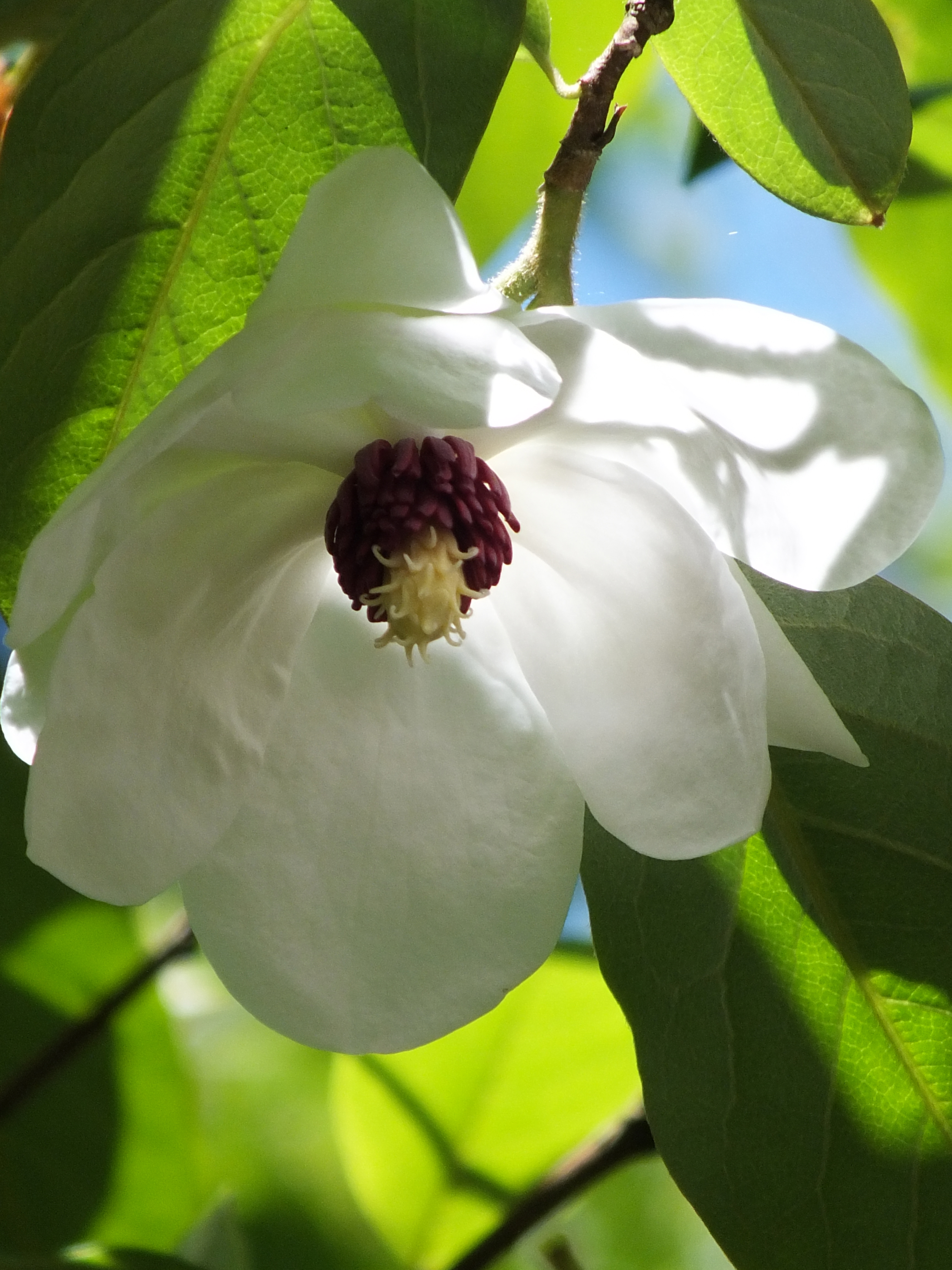 The pristine, cupped, pendant white blooms of Magnolia wilsonii. A spreading tree with the sun backlighting the beautiful waxy flowers with crimson stamens. Big flowers, but shy, hanging beneath the canopy of glossy leaves.