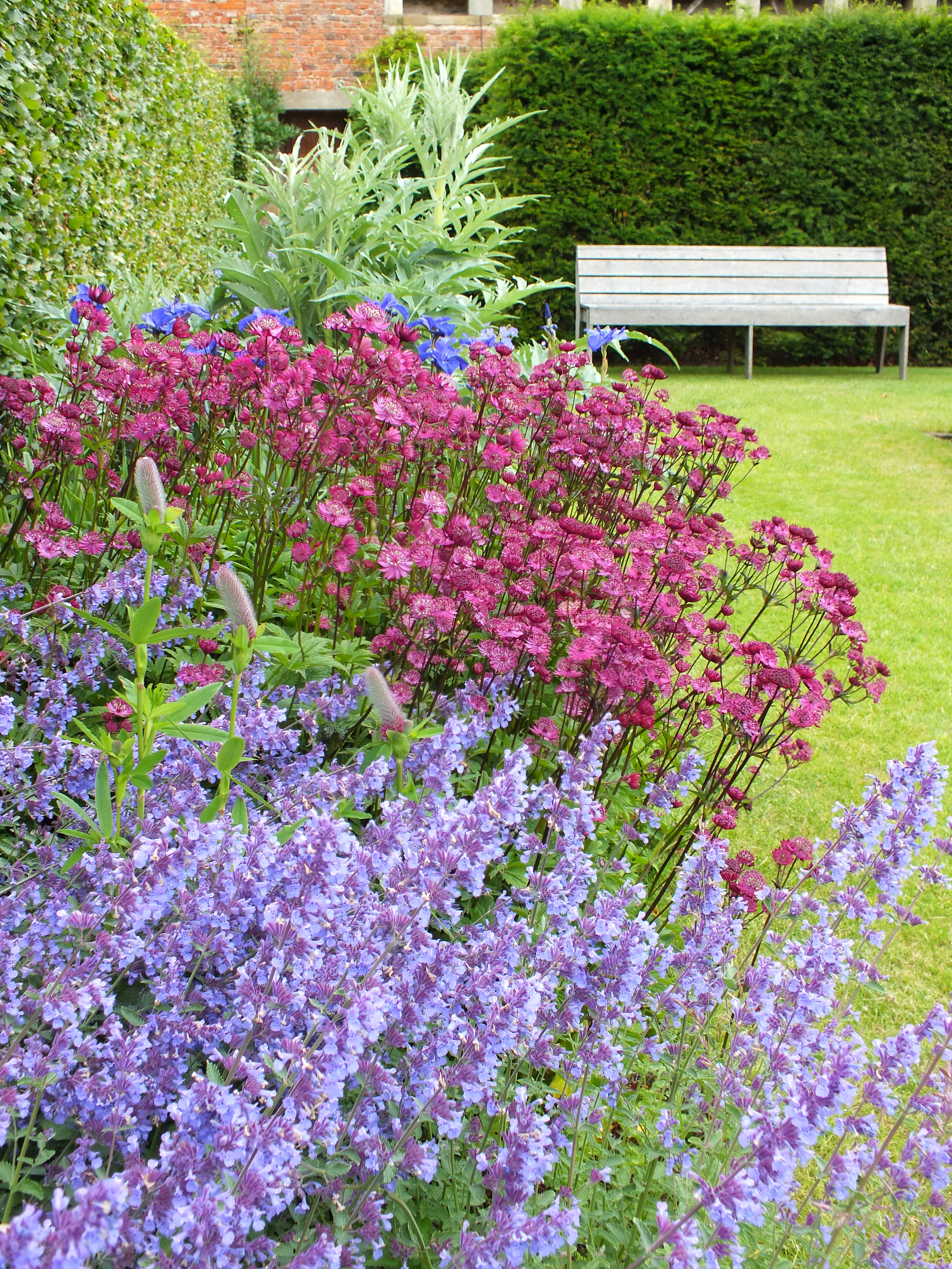 Three metre squares of box sit within traditional herbaceous borders backed by beech hedges -the choice of plants ensures that they look their best at different times of year.