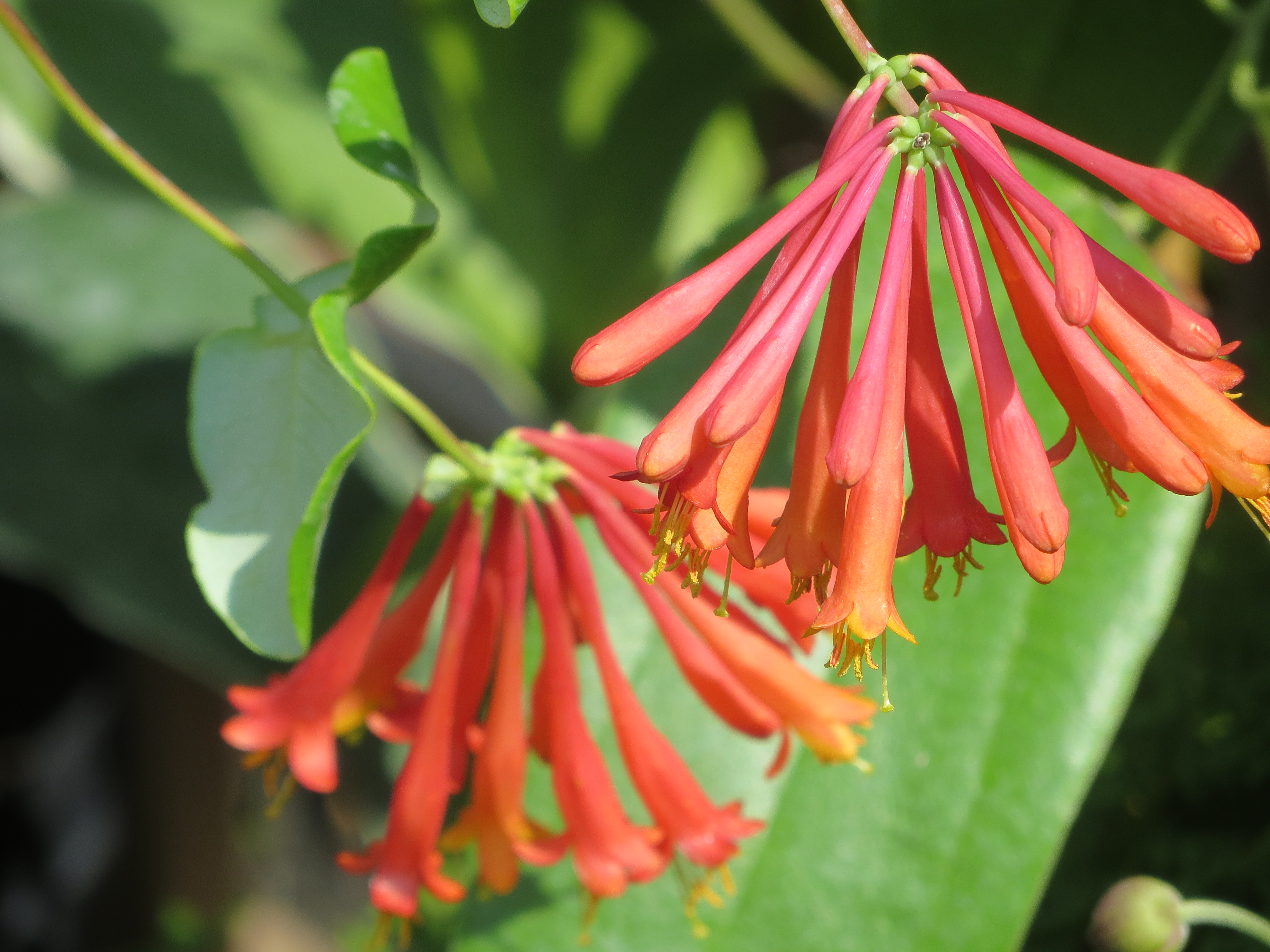 Bright the flowers of this honeysuckle may be, and unusual for all that too, but not scarlet. In common with many of these orange-red honeysuckles, there is very little scent but the eye catching display, from July through to September, makes up for being invisible, olfactory-wise.