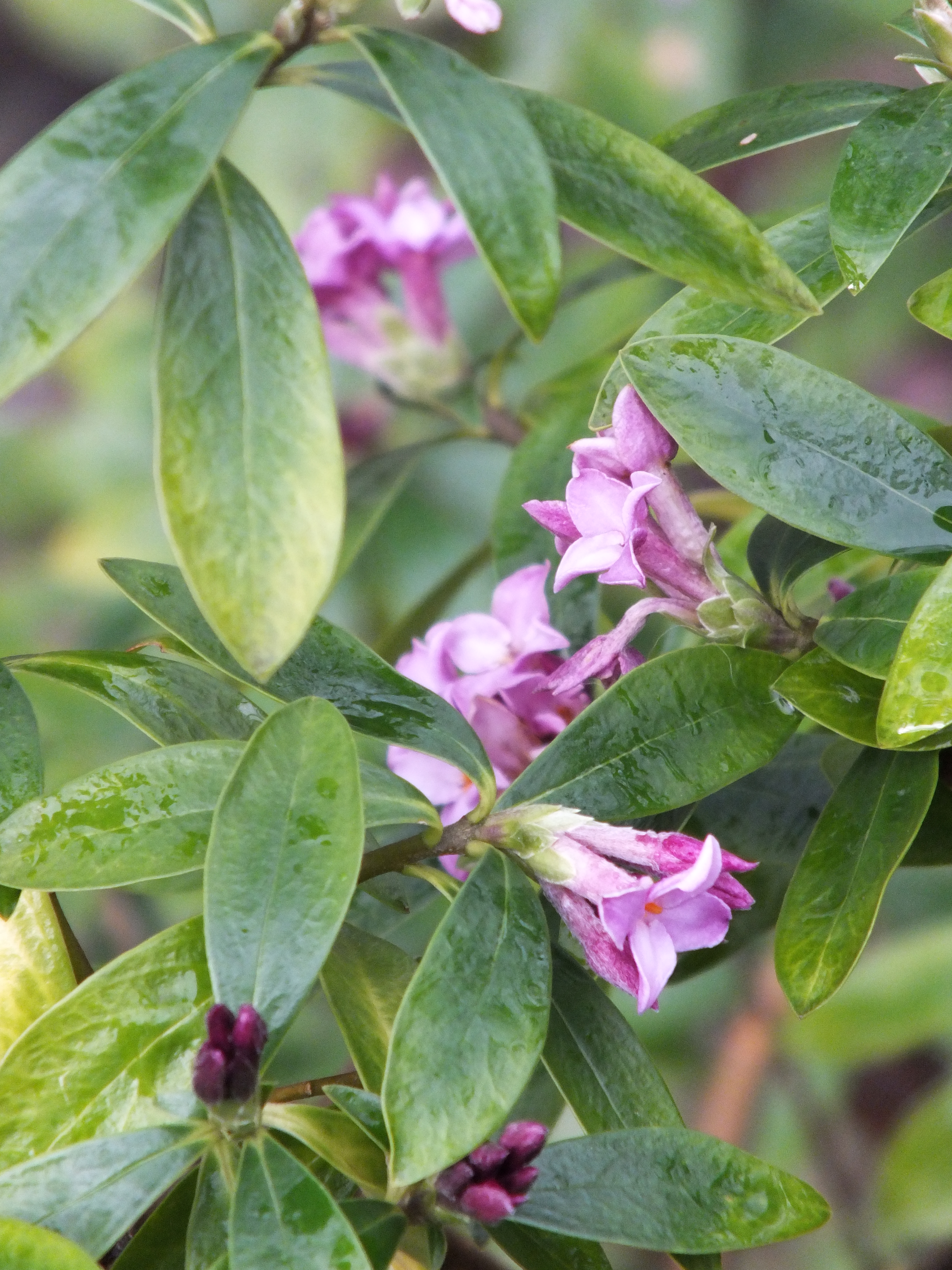 Daphne x hybrida – Presumed to be a cross between Daphne odora and Daphne collina. Known since 1928. It is much like Daphne odora in its leathery glabrous leaves and exquisitely scented flowers, purplish in bud but opening paler, produced in the cool of the year, not the summer. A neat small shrub of considerable excellence, reasonably hardy, and unaccountably rare.