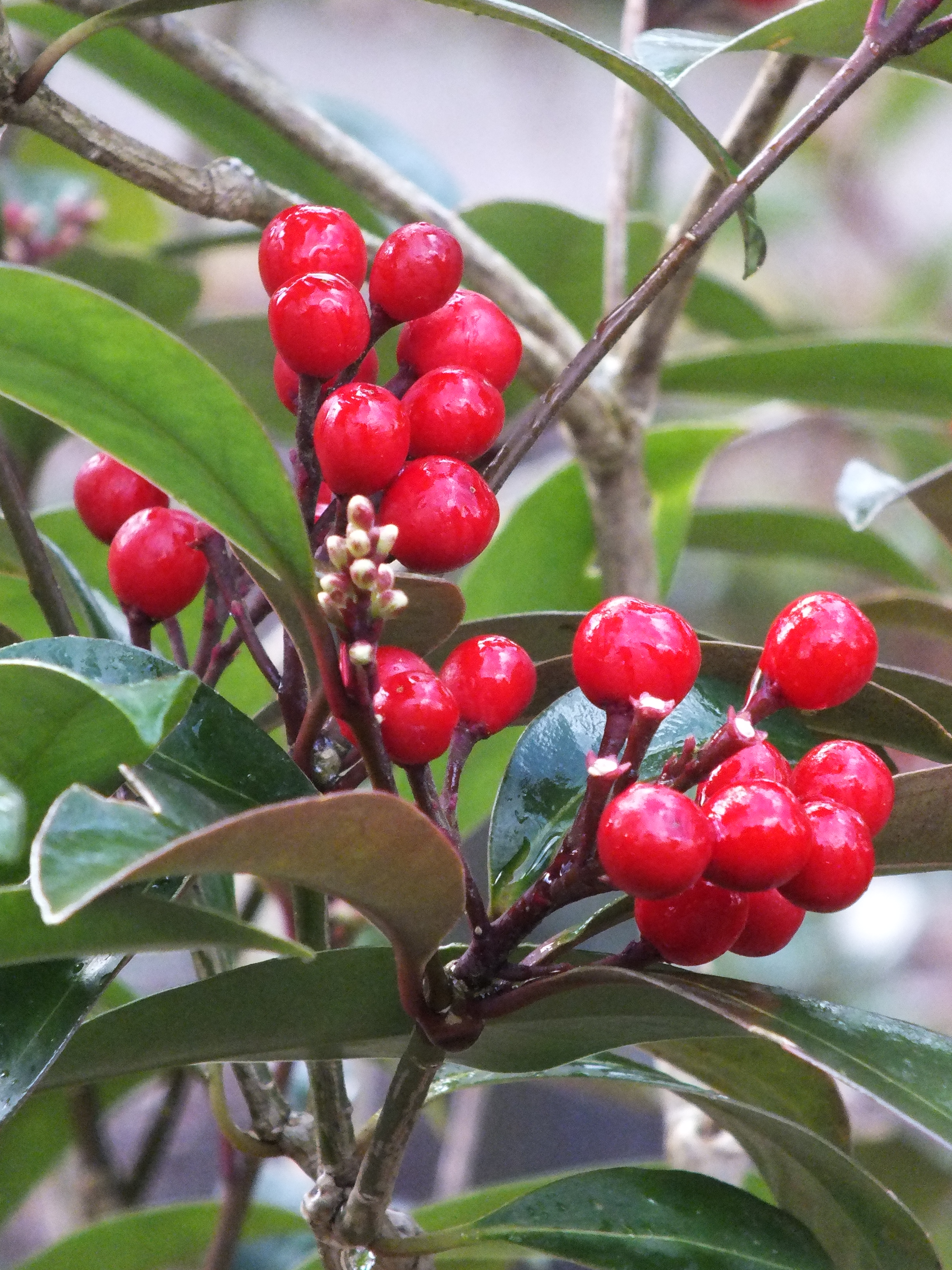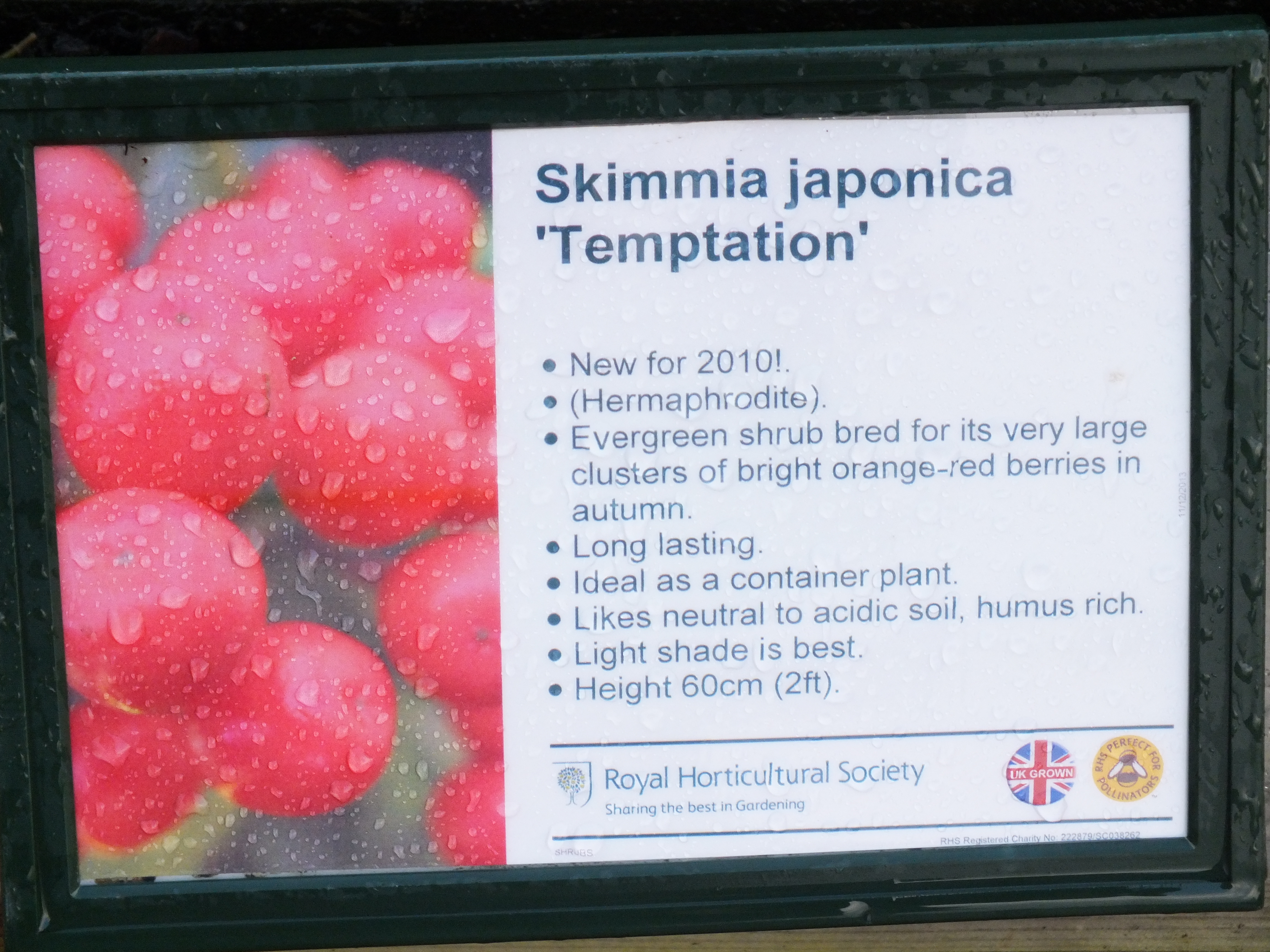 This example was on the woodlands slopes of Battleston Hill at RHS Wisley, Skimmia japonica subsp. reveesiana ‘Chilan Choice’