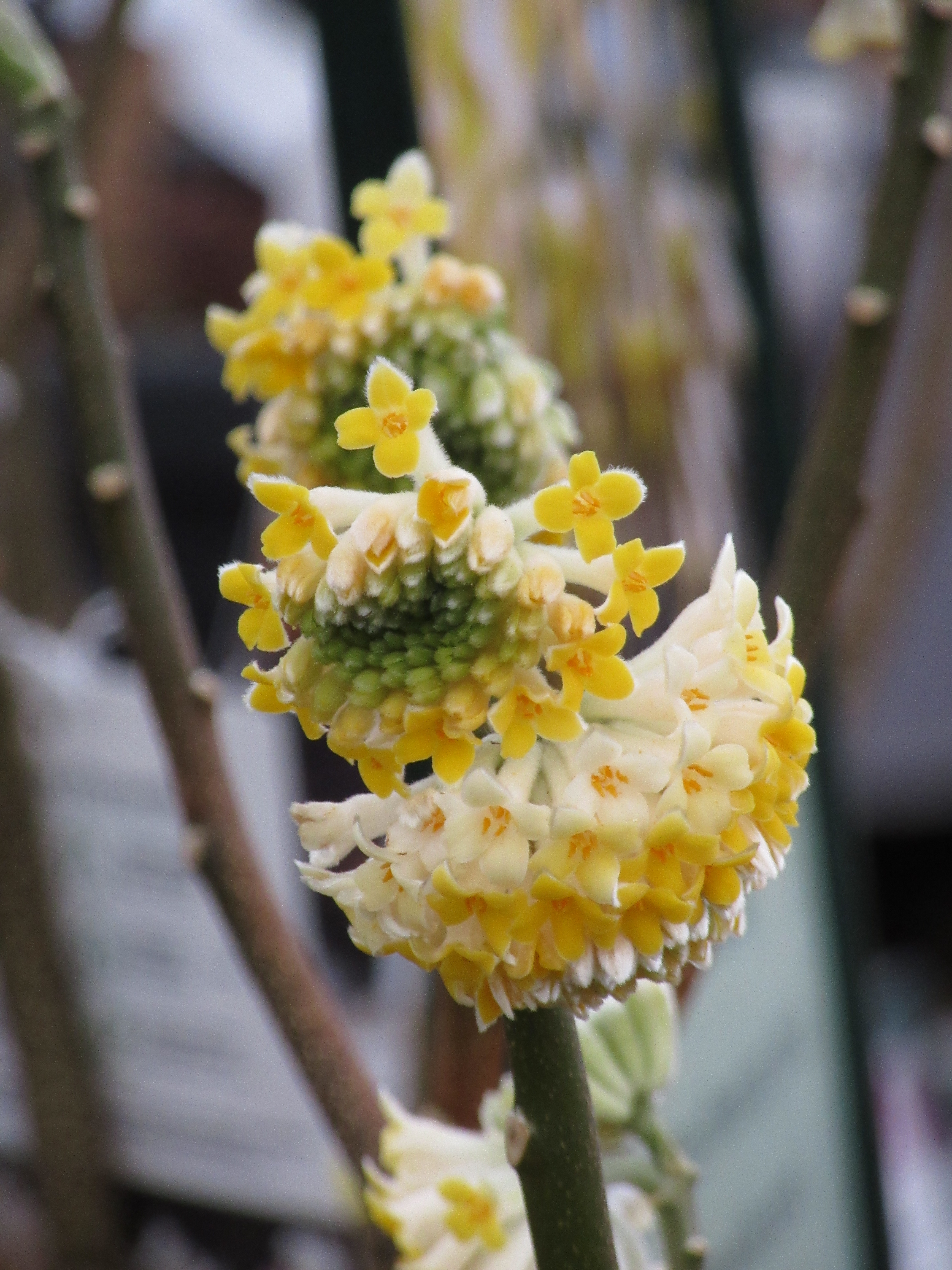 Fragrant too are Edgeworthia chrysantha which are breaking bud – tight grey, felted chrysanthemum buttons popping open to globes of deep yolky-gold, on the tips of smooth bare branches.