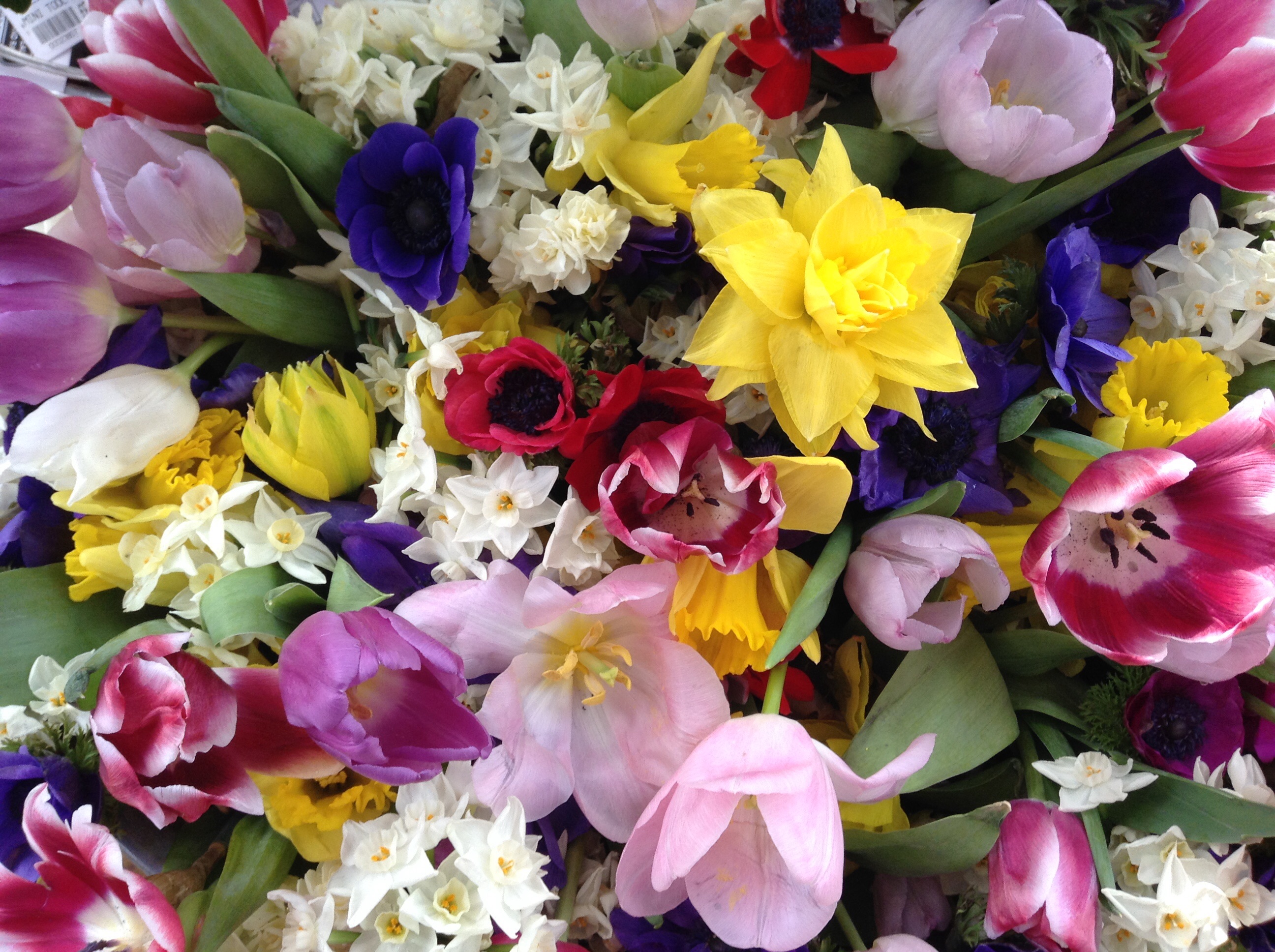 So much colour exploding in our gardens now that winter is loosening its grip and Spring is given a chance – longer days, some sunshine but still chill nights and cool temperatures yet … the sap is rising, buds are bursting into leaf and blossom and the woodland floor is a bright mosaic of primroses, crocus, hellebores, narcissus, anemones, pulmonarias and more. OK not tulips just yet – this is a touch of artistic license provided by Covent Garden Flower Market!