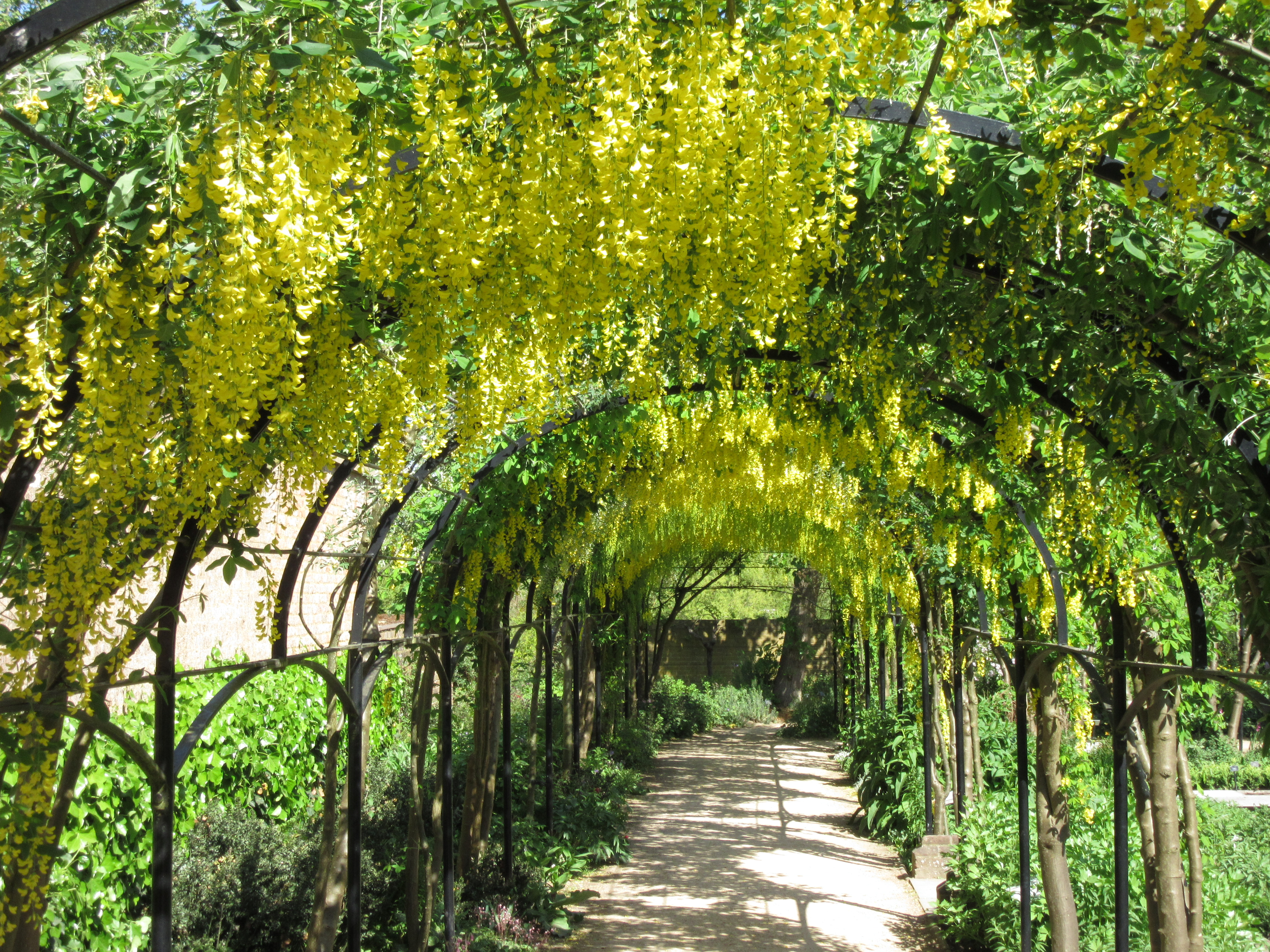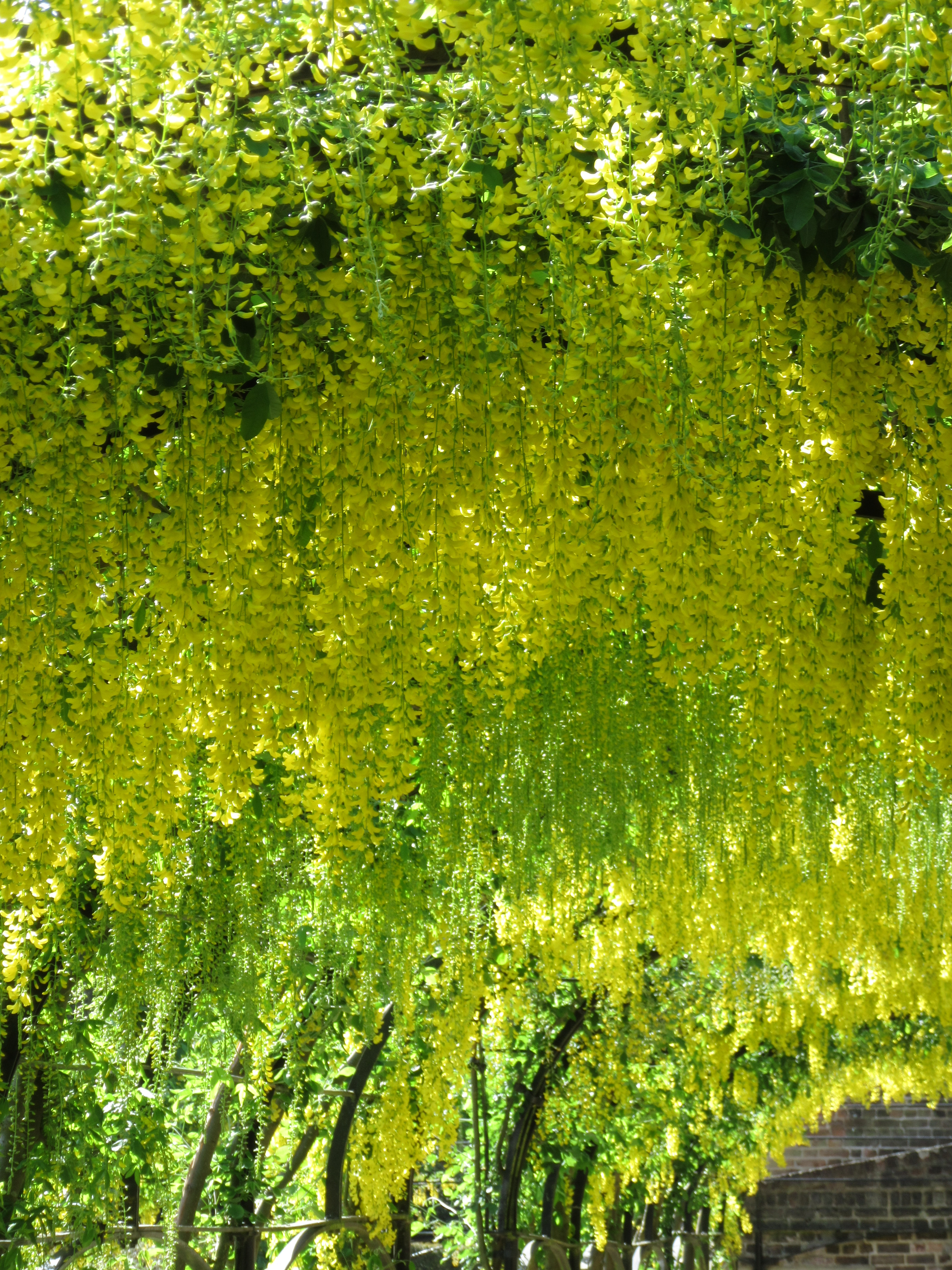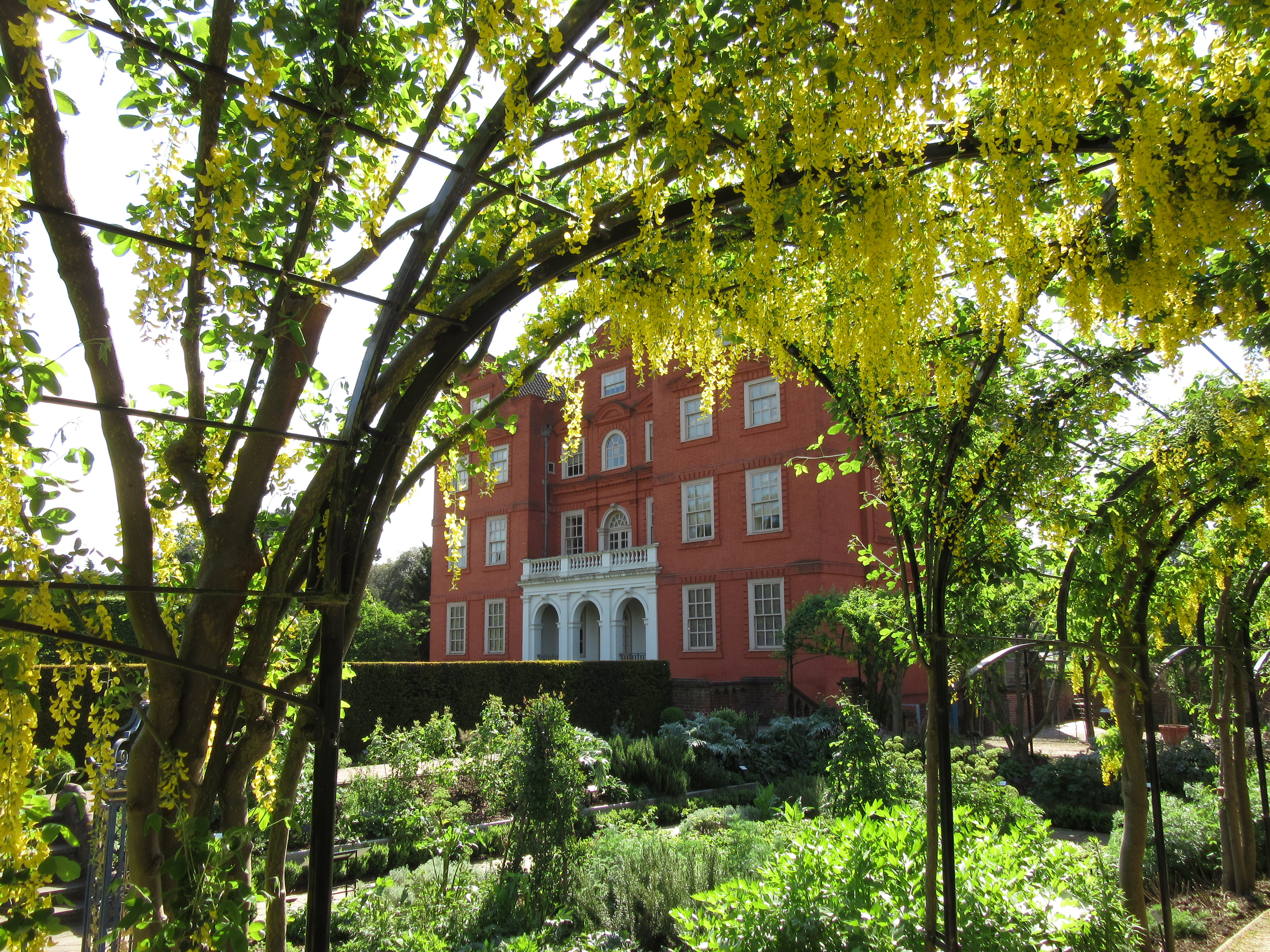 A bee-line today straight over to Kew Palace and the gardens behind – a sunken herbalists garden and a more formal parterre. Around the former, an arched pergola wrapping around three sides of the garden with Laburnum threaded through the metal tracery. It hasn’t peaked yet – another week and it will be quite sumptuous but then again, I might easily have missed its nadir – and rain is forecast for tomorrow and that might spoil the blossom.
