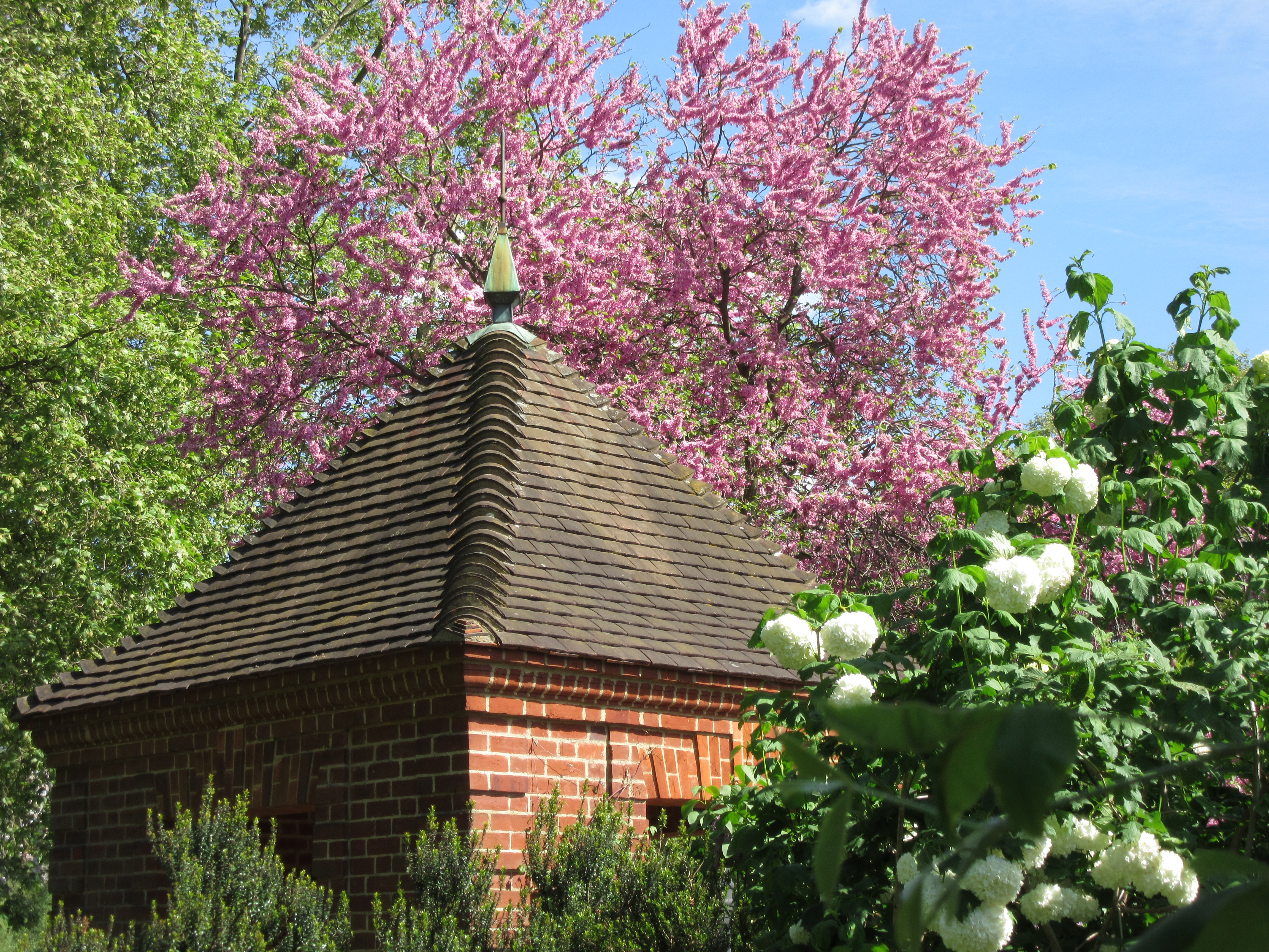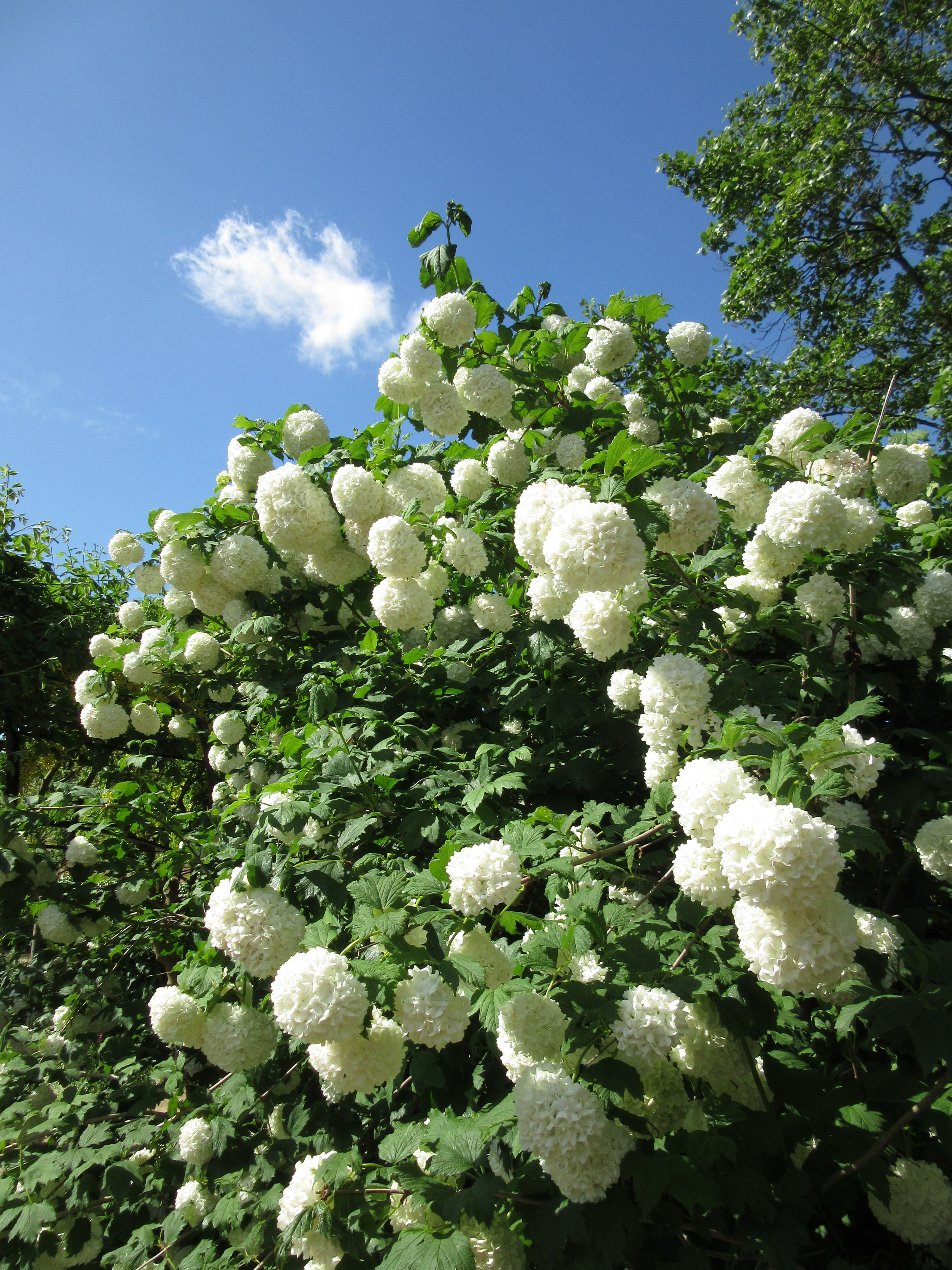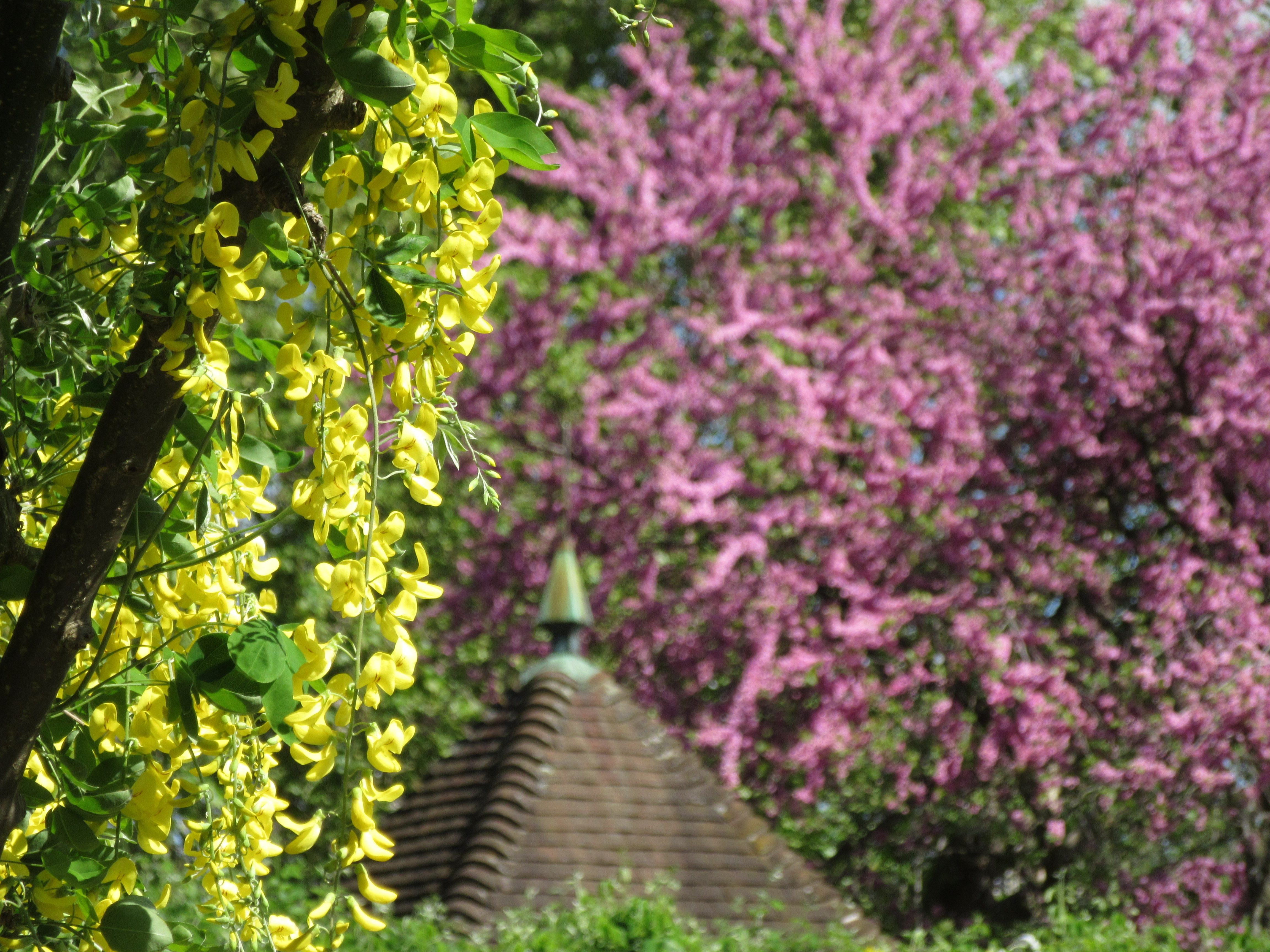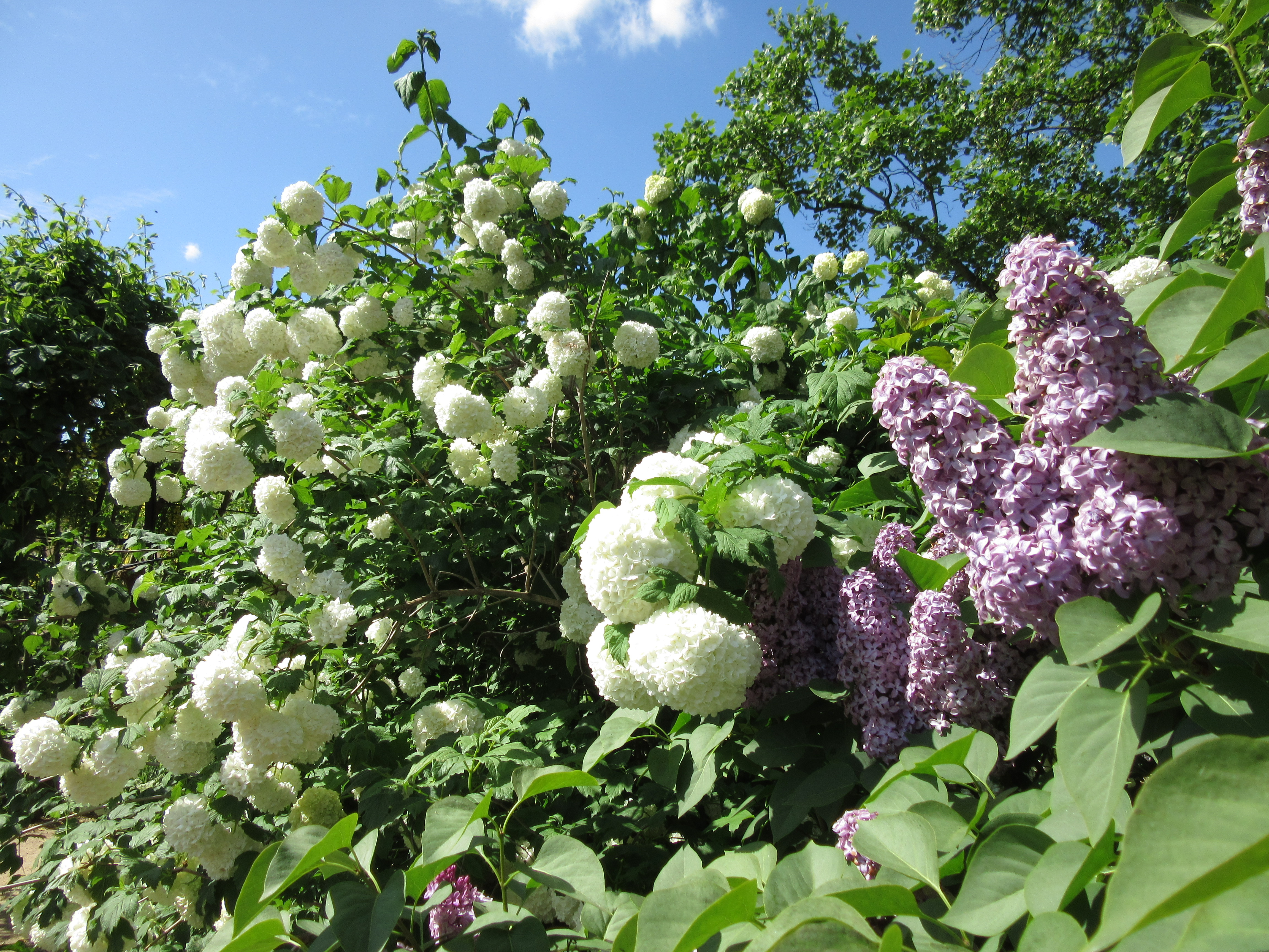 Bright blue skies, golden Laburnum, lilac-pink Cercis siliquastrum, snowballs of Viburnun opulus, pale blue iris, lavender-grey lilacs and a lot of beautiful greenery.