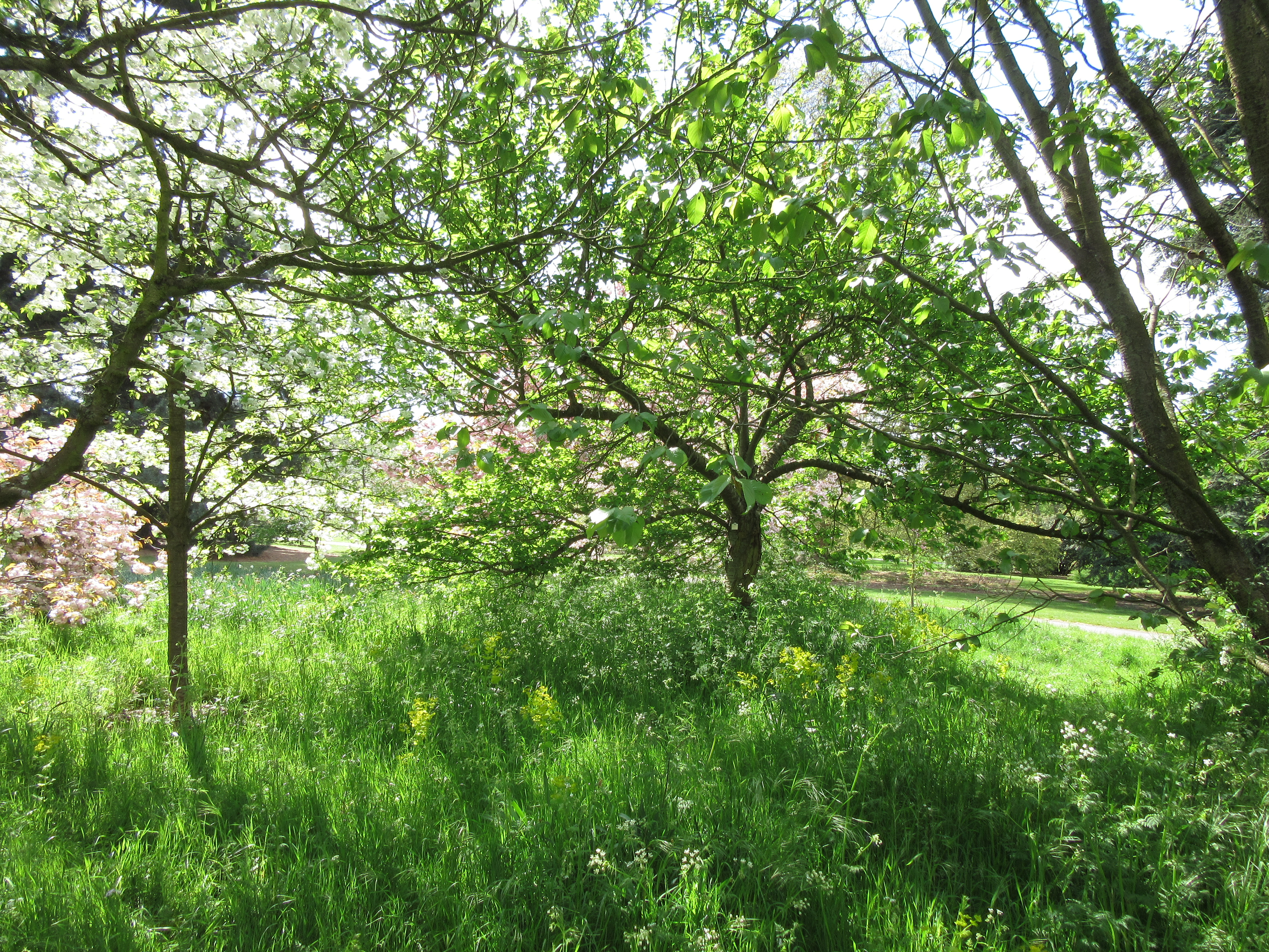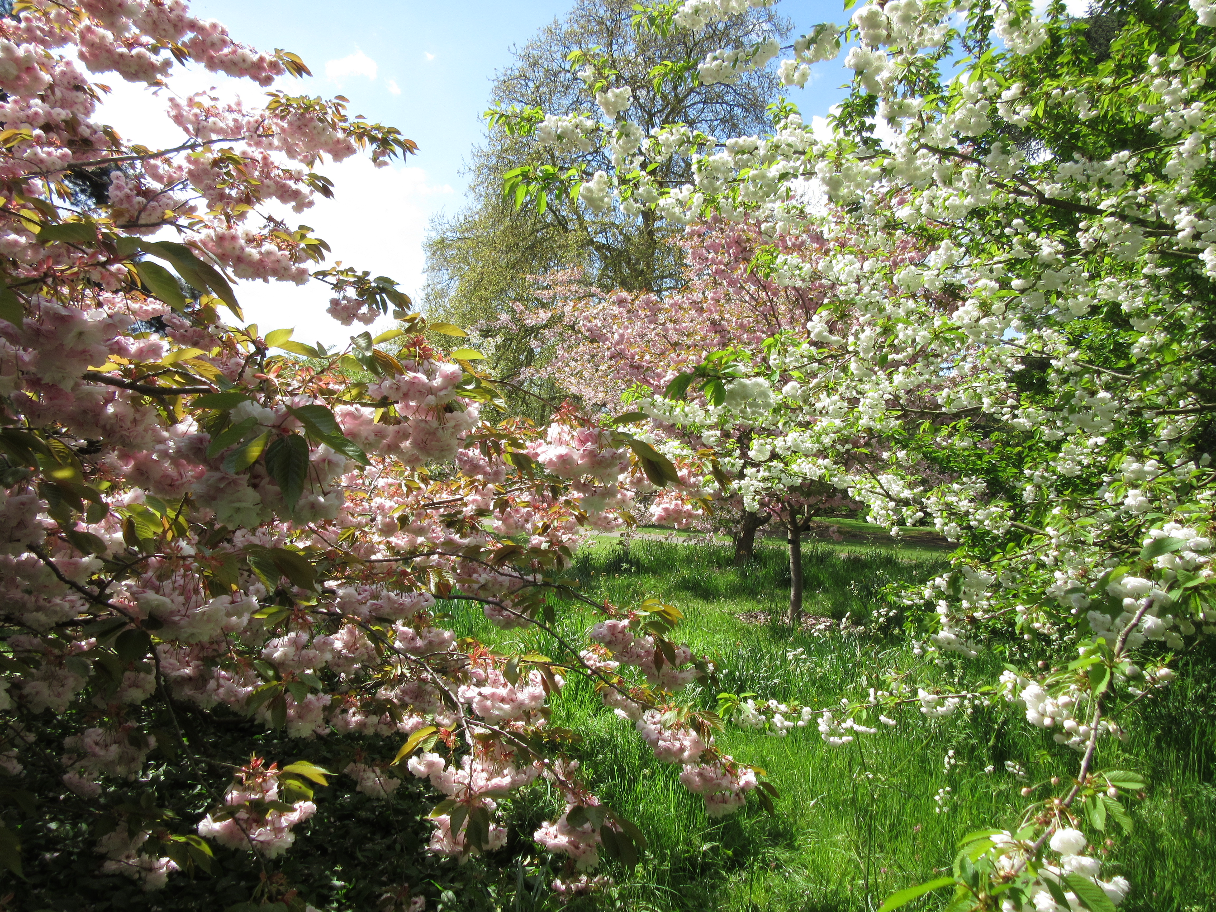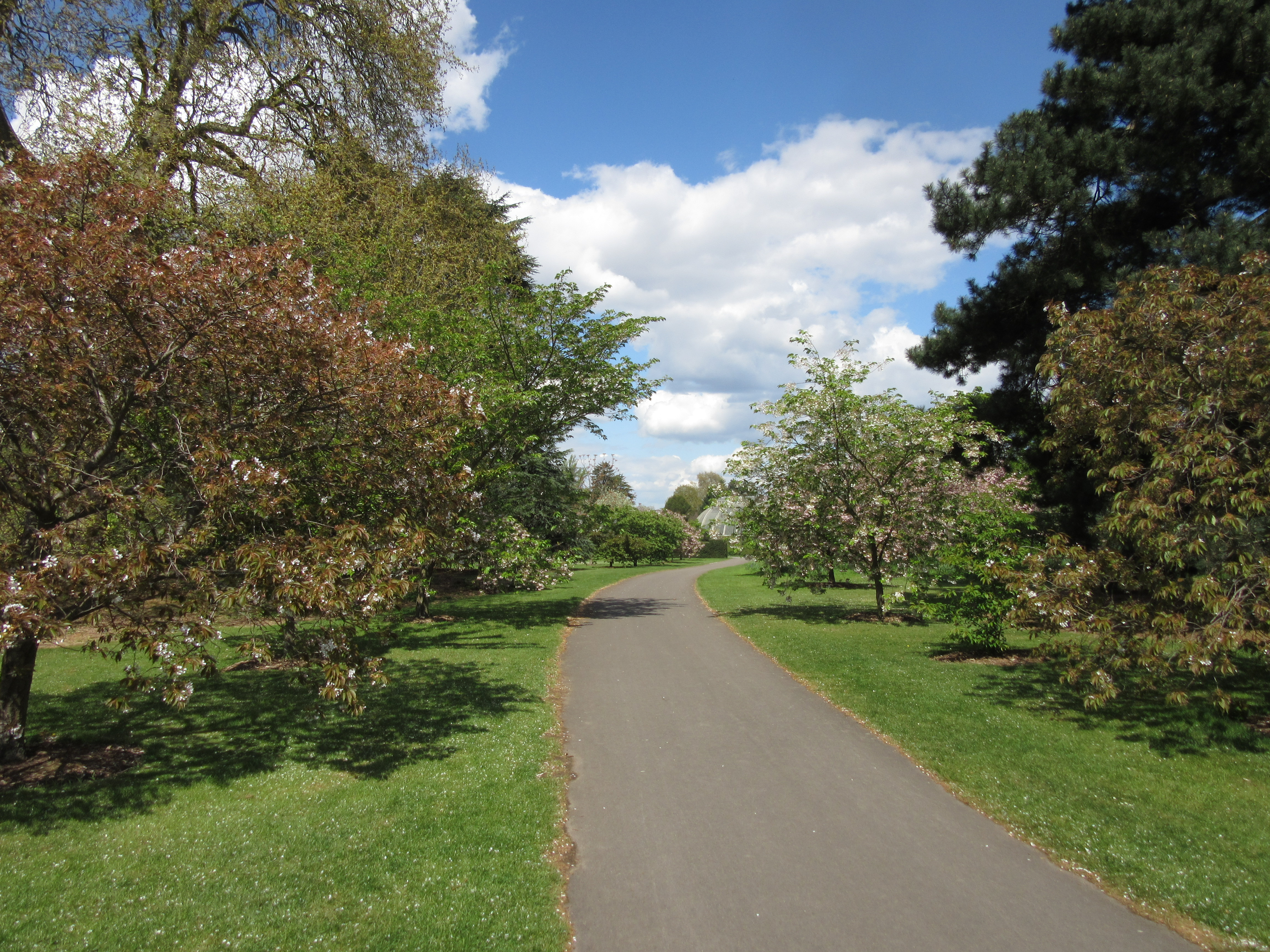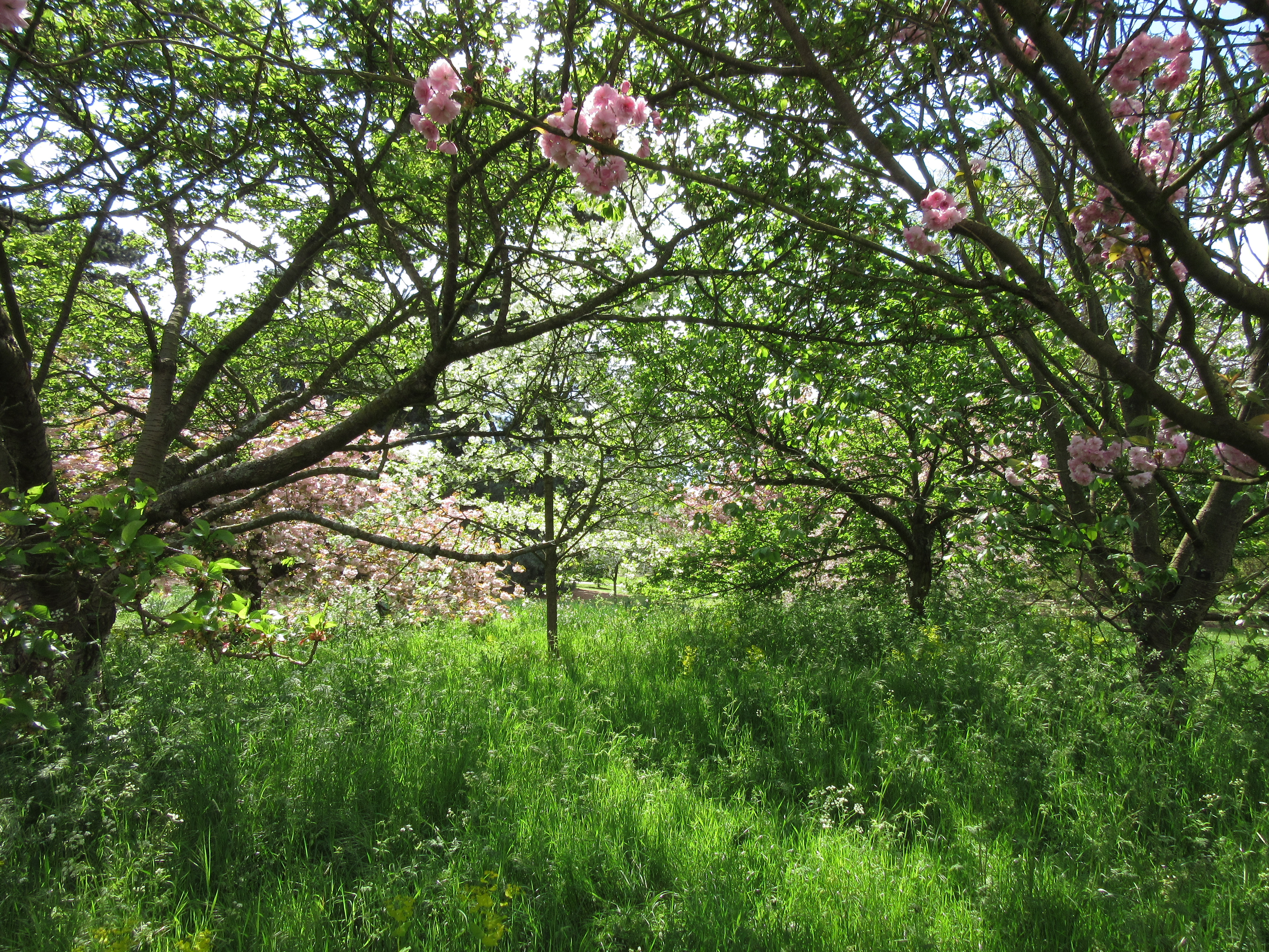 The Cherry Walk at Kew Gardens, coming up from the Mediterranean Garden and heading towards the roses and Palm House. A couple of weeks ago, this path was lined with pink and white confections, flurries of blossom in candyfloss shades – but now green is the theme. Yet…